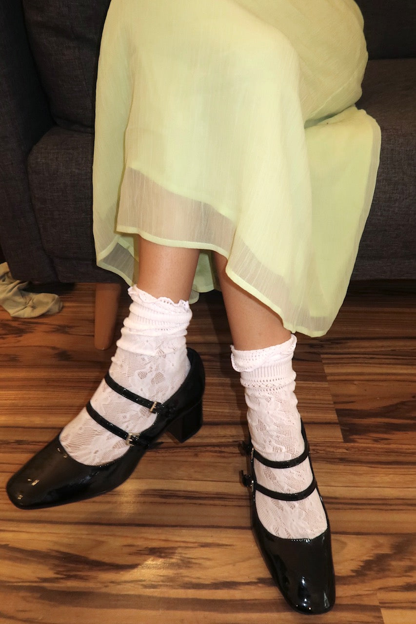 Complete the Pistachio Matcha Dress with classic Mary Janes for a look that's effortlessly chic. The timeless silhouette of the shoes pairs perfectly with the dress's flattering fit, proving that the right footwear can elevate any outfit.